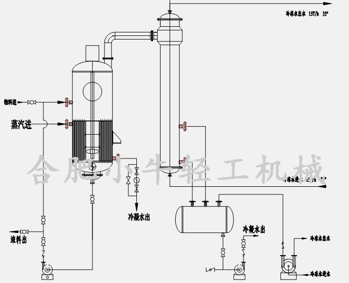 加熱器是由沸騰加熱管及中央循環(huán)管和上下管板所組成的豎式加熱管束,保證溶液充分被加熱和良好循環(huán)。中央循環(huán)管與加熱管一般采用脹管法或焊接法固定在上下管板上,從而構(gòu)成一個豎式加熱管束。溶液在管內(nèi)流動,而加熱蒸汽在管束之間流動。為了提高傳熱效果,在管間可增加若干擋板,或抽去幾排加熱管,形成蒸汽通道,同時,配合不凝結(jié)氣體排出管的合理分布,有利于加熱蒸汽均勻分配,加熱器體外側(cè)都有不凝結(jié)氣體排出管,加熱蒸汽管,冷凝水排出管等,從而提高傳熱及冷凝效果。
